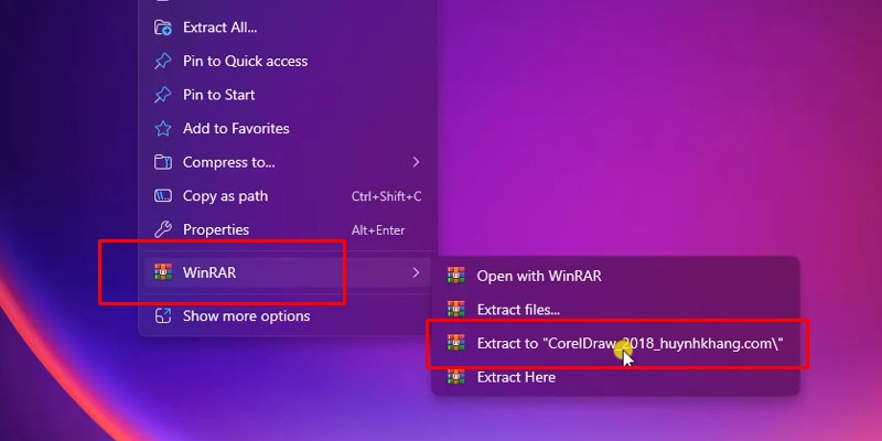 - Sử dụng WinRAR để giải nén file vừa tải bằng cách nhấp chuột phải và chọn “Extract Here”.