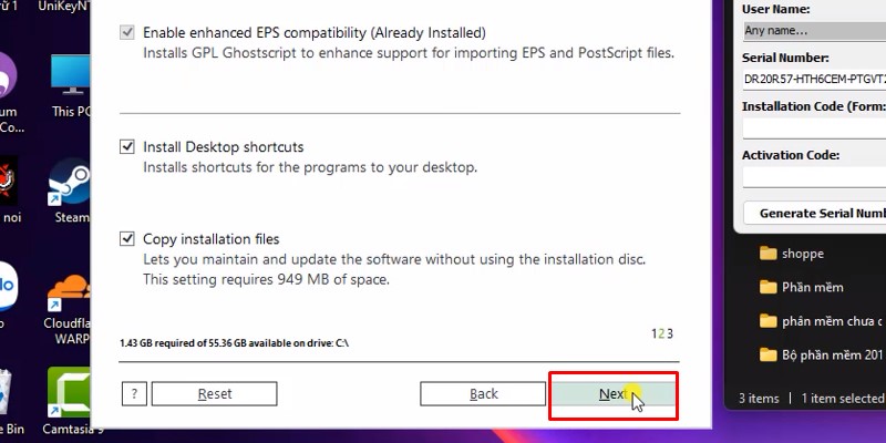 Coppy dãi số Serial NumberBước 8: Dán vào ô như hình và bấm next