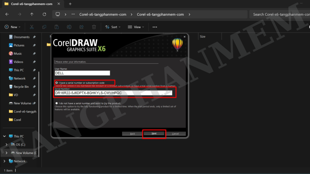 Bước 5: Sử dụng Keygen: Mở tệp Keygen, chọn chương trình “CorelDRAW X6”, sao chép mã hiển thị.