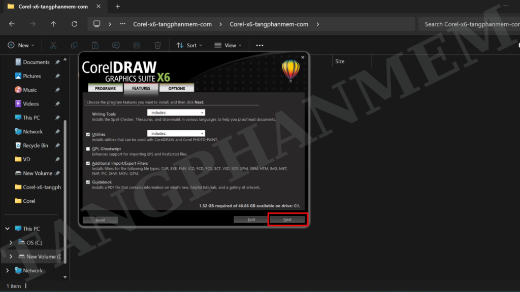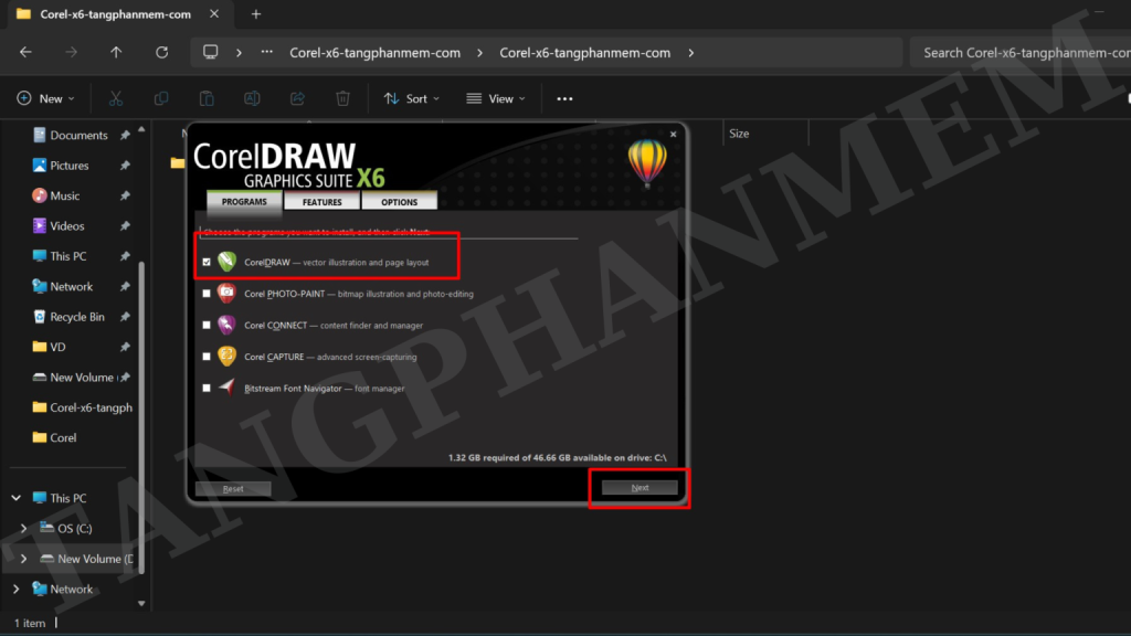 Bước 8: Chọn thành phần: Chọn “CorelDRAW” và nhấn “Next” hai lần.