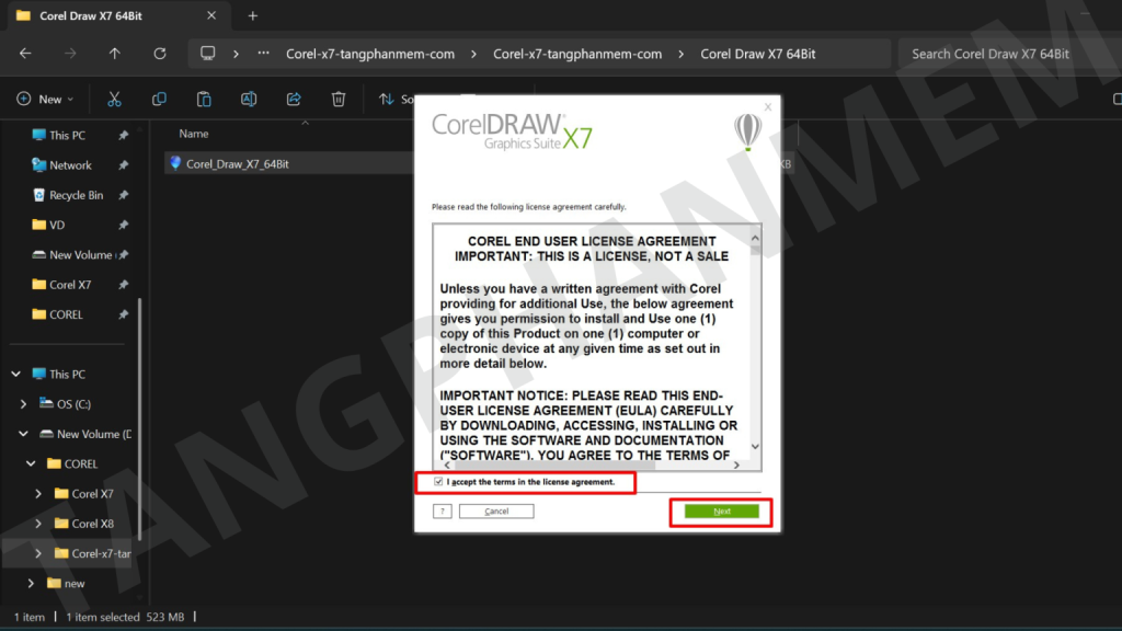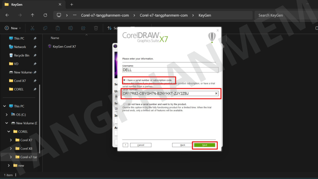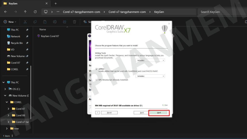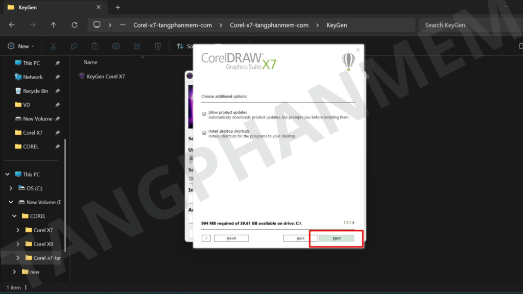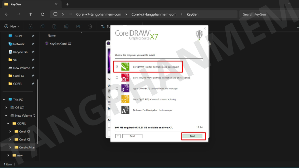Bước 8: Chọn phiên bản: Chọn “CorelDRAW X7” và nhấn “Next” ba lần.