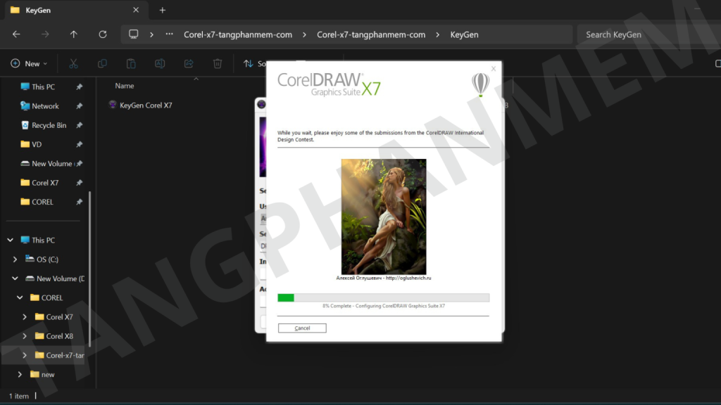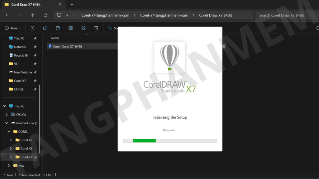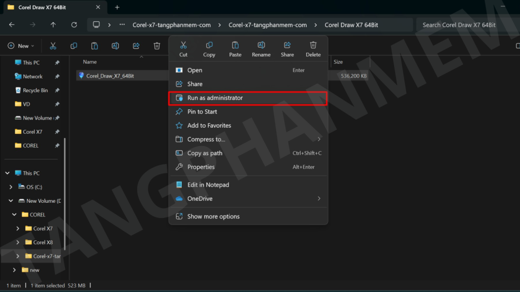 Bước 3: Chạy cài đặt: Mở thư mục tương ứng với cấu hình máy (32-bit hoặc 64-bit), nhấp chuột phải vào tệp “Corel_Draw_X7” và chọn “Run as Administrator”. Chờ trong giây lát.