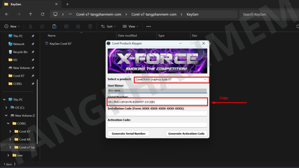 Bước 5: Sử dụng Keygen: Mở thư mục “Keygen”, chạy tệp “Keygen Corel X7”, chọn “Select a Product” và sao chép mã hiển thị.